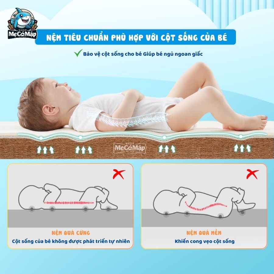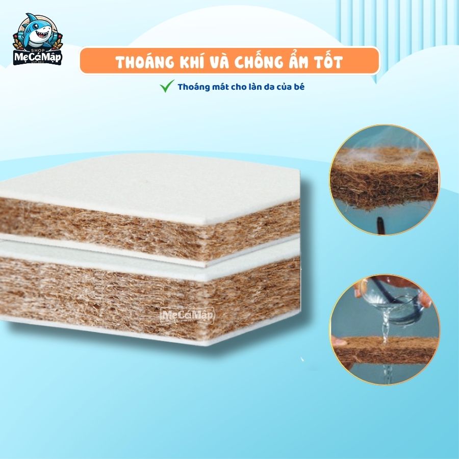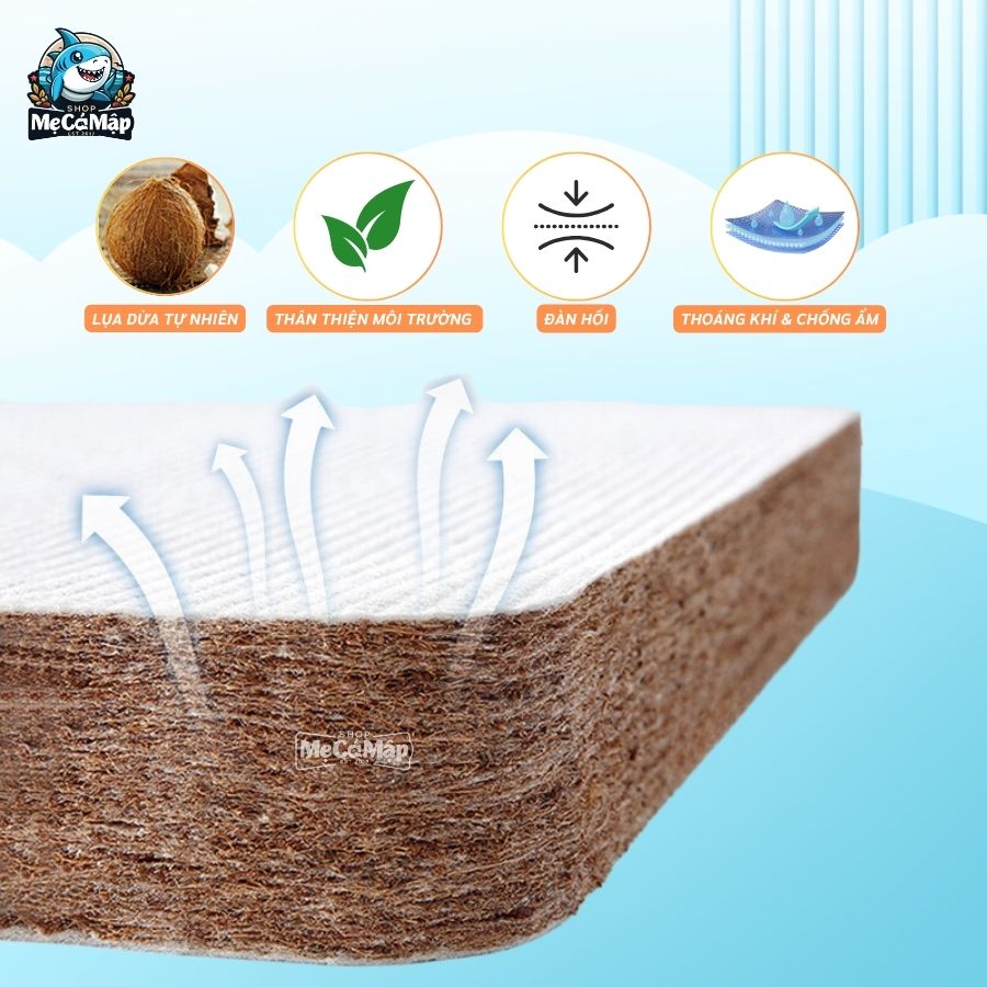 Cấu trúc từ xơ dừa với độ đàn hồi vừa phải, giúp nâng đỡ cơ thể bé tối ưu, giữ tư thế nằm thẳng, không gây bí bách khi nằm lâu. Đệm còn có khả năng hút ẩm và chống ẩm tốt, loại bỏ mồ hôi và độ ẩm kịp thời, giúp giữ cho bé luôn thoáng mát và dễ chịu.