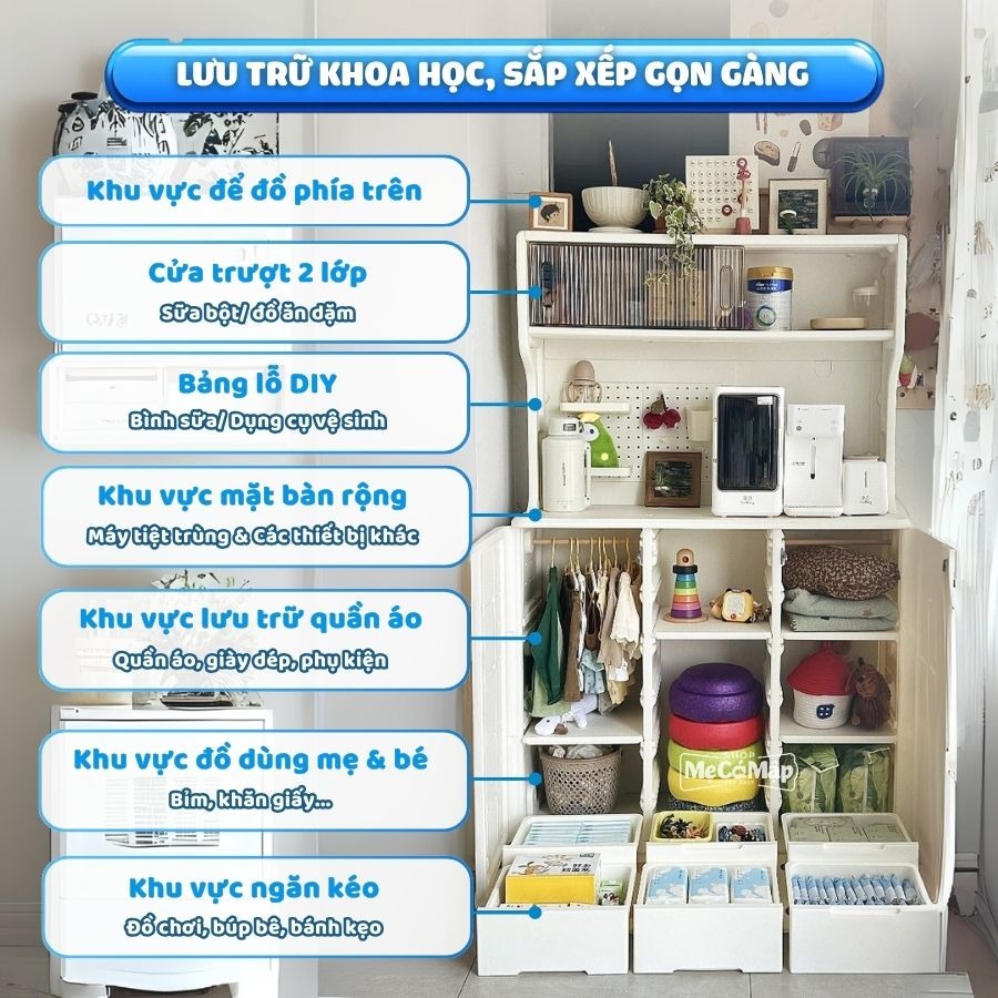 – Thiết kế lưu trữ nhiều lớp, dung lượng lớn tối ưu sắp xếp thông minh, riêng biệt từng nhóm đồ dùng. Có thể dùng ở phòng khách, phòng ngủ, hoặc phòng học của bé.